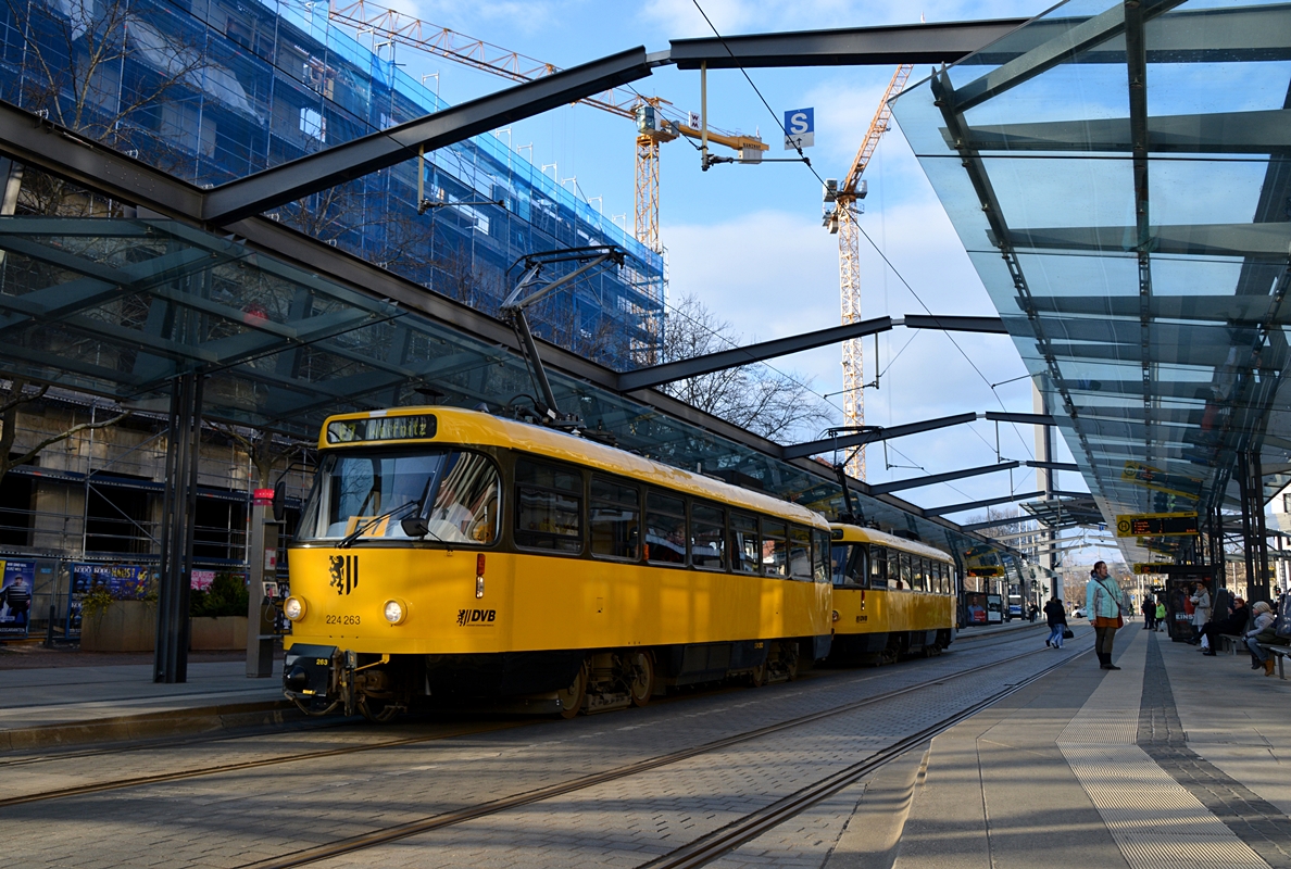 Dresden, Wallstraße. Tatra T4D-MT-Traktion (Wagen 224 263 und 224 265) als Linie E7 nach Wölfnitz steht an der Haltestelle Postplatz. Die Aufnahme stammt vom 13.02.2018.