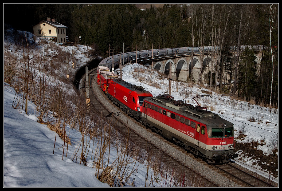 1142 643 + 1144 095 mit Güterzug beim Kalte-Rinne-Viadukt am 8.03.2018.