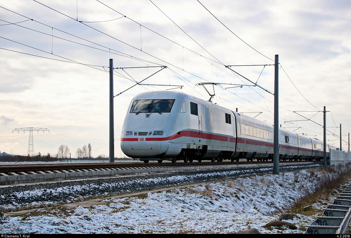 Nachschuss auf 401 562 (Tz 162 "Geisenheim/Rheingau") als ICE 599 (Linie 11) von Hamburg-Altona nach München Hbf, der bei Dieskau auf der Neubaustrecke Erfurt–Leipzig/Halle (KBS 580) fährt. [4.2.2018 | 13:02 Uhr]