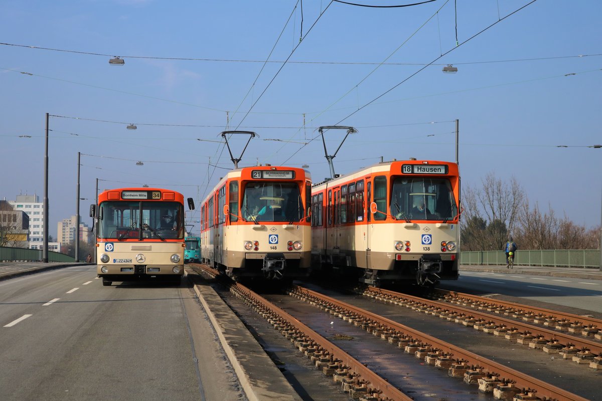 VGF Mercedes Benz O305, Düwag Pt Wagen 148 und 138 bei Frankfurt Hausen bei einer Sonderfahrt am 04.03.18 auf der Breitenbachbrücke