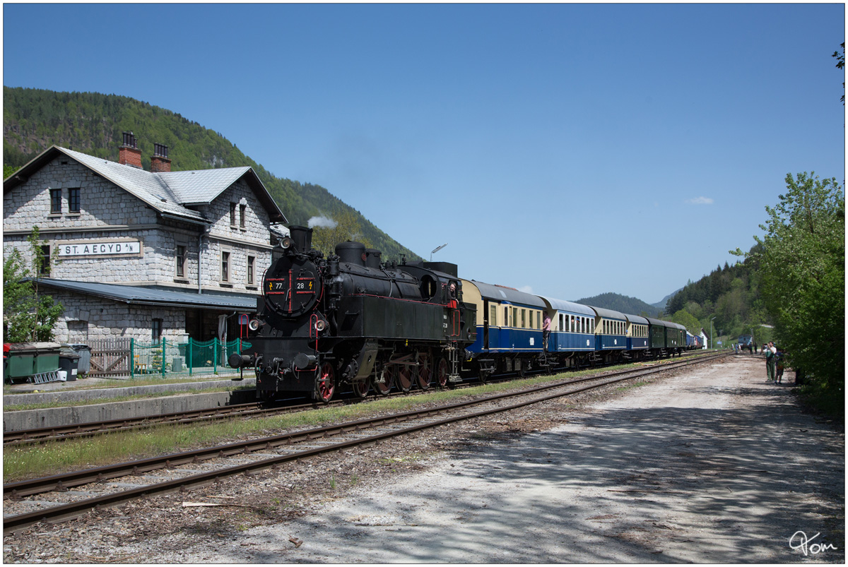Die ÖGEG Dampflok 77.28 fährt mit SR 14533 zum "Radfrühling im Traisental" von St Pölten nach Markt St.Aegyd. Bahnhof St.Aegyd 29.4.2018