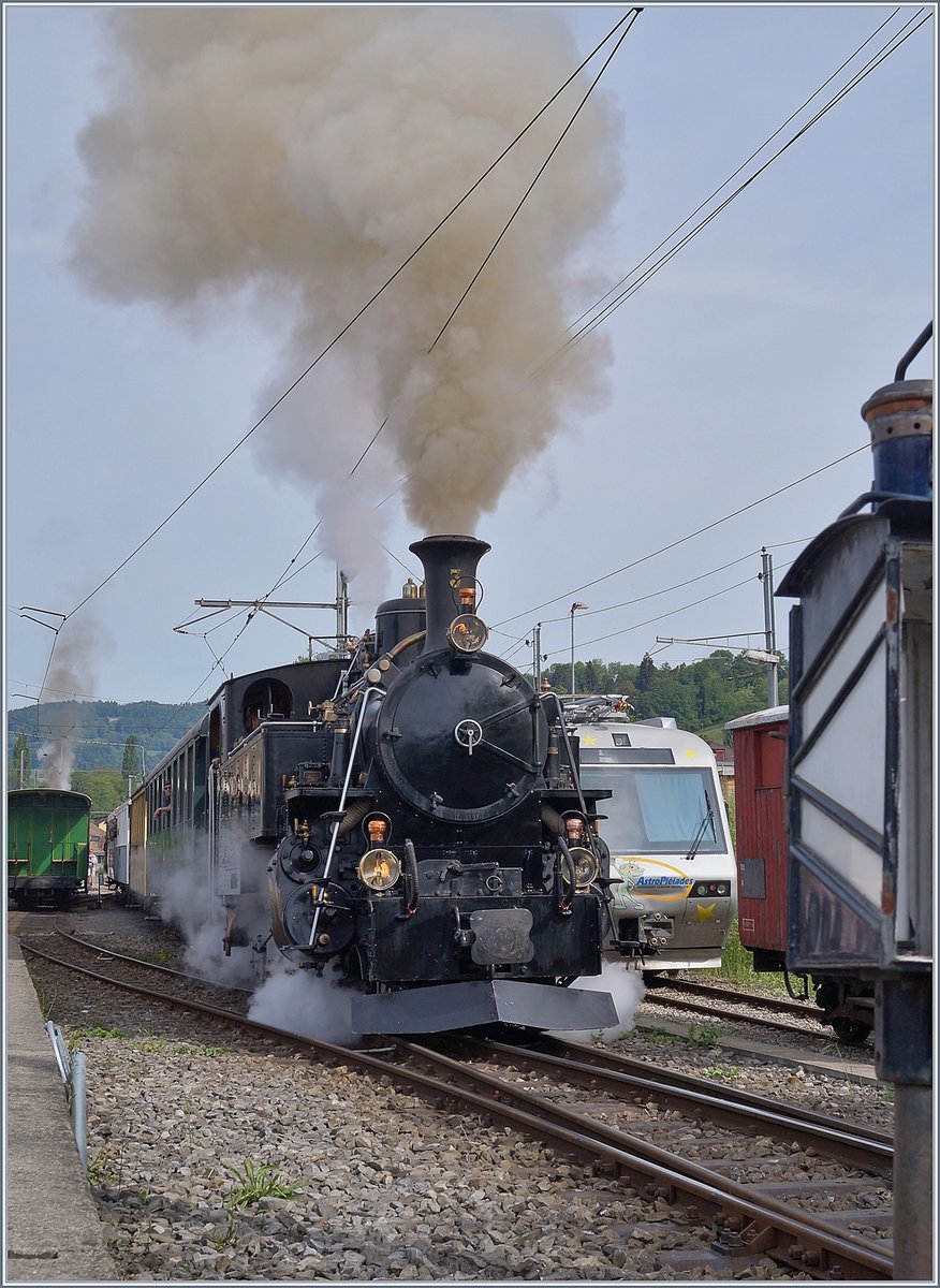 Das hübsch geschmückte "Wappentier" der Blonay-Chamby Museumsbahn Bahn und schon seit fünfzig Jahren dabei: die SEG G 2x 2/2 105 (Baujahr 1918) in Blonay.