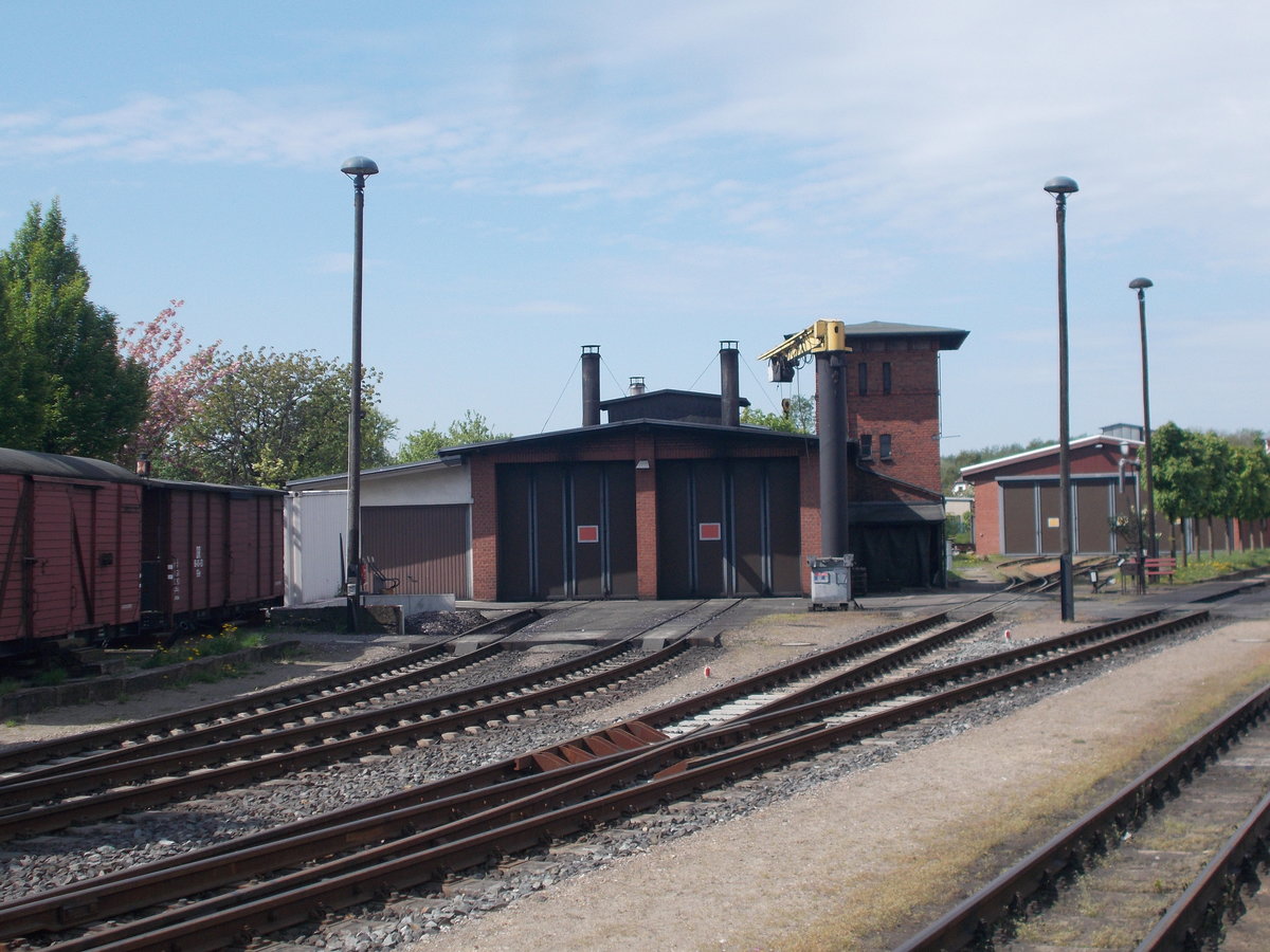 Lok-und Wagenschuppen beim Molli,am 10.Mai 2018,in Kühlungsborn West.Links zwei radlose GGw`s.