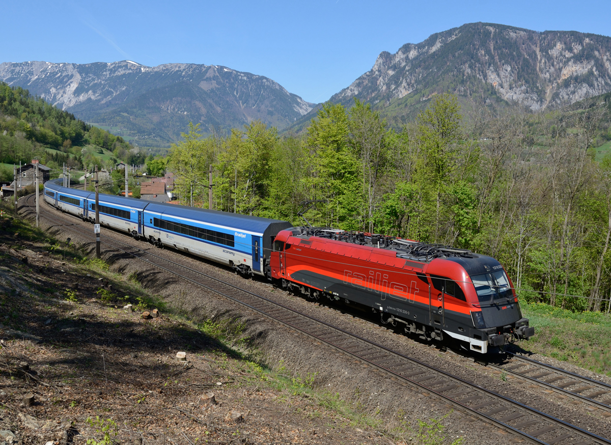 Die 1216 230 war am 18.April 2018 mit dem RJ 73 "Bedrich Smetana" von Praha hl.n.nach Graz Hauptbahnhof unterwegs und wurde von mir zwischen Payerbach und Küb fotografiert.