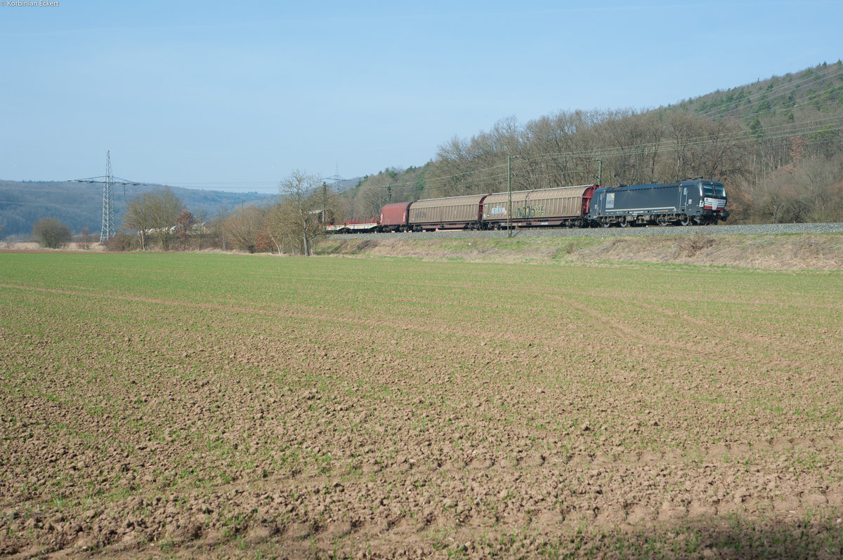 185 531 der TX Logistik mit einem KLV-Zug bei Harrbach Richtung Gemünden, 16.03.2017