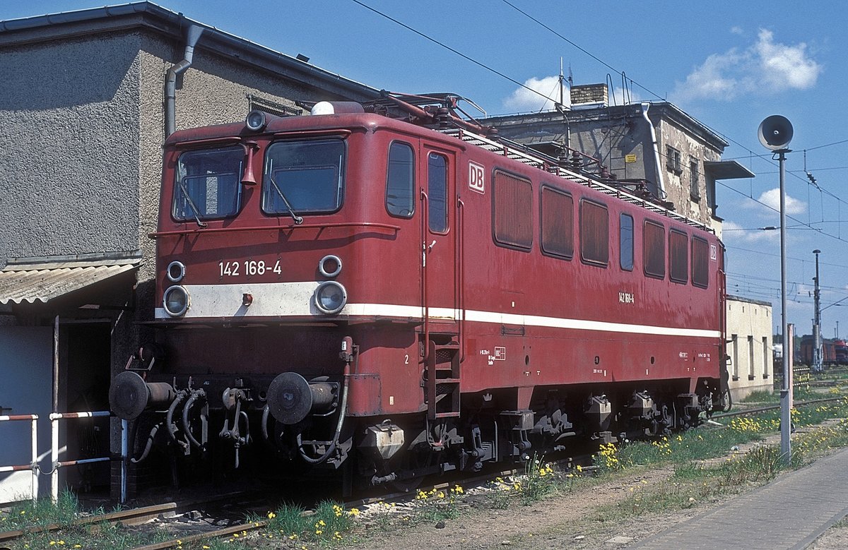 Am 05.05.18 führt 140 853 einen Containerzug durch Braschwitz Richtung Halle(S).