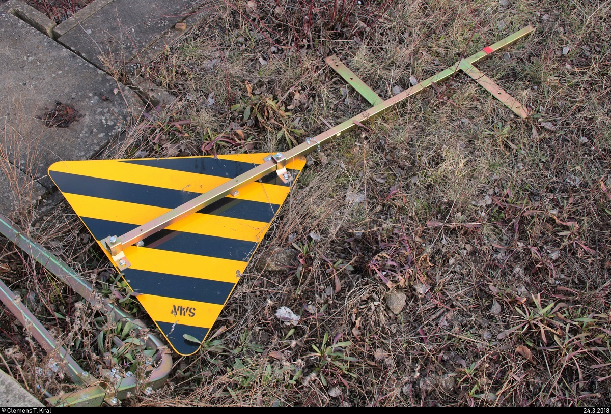 Blick auf eine "Lf 1"-Tafel (Langsamfahrscheibe) im Hp Leipzig Messe am Ende des Bahnsteigs 1/2, die eine vorübergehende Langsamfahrstelle ankündigt. Da sie wohl nicht benutzt wurde, lag sie verkehrt herum auf dem Boden. [24.3.2018 | 16:32 Uhr]