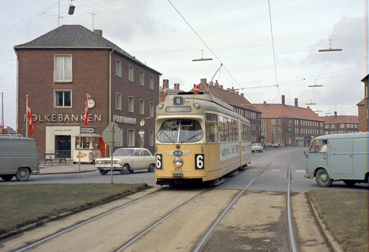 København / Kopenhagen Københavns Sporveje SL 6 (DÜWAG-GT6 893) Valby, Ålholmvej / Valby Langgade / Vigerslevvej am 11. März 1969. - Anlässlich des Geburtstages Frederiks des Neunten, des damaligen Königs, mussten öffentliche Institutionen (Postämter, Gerichtsgebäude, Schulen u.v.a.) und auch die Straßenbahnen flaggen. - Auch viele private Einrichtungen wie z.B. Banken flaggten. - Vor der Bank (links im Bild) steht ein Wurstwagen; solche Wagen waren damals öfter als jetzt im Straßenbild zu sehen, aber es gibt sie noch. - Scan eines Farbnegativs. Film: Kodak Kodacolor X.