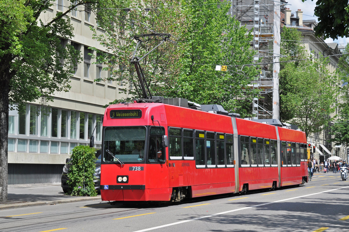 Be 4/6 Vevey Tram 738, auf der Linie 3, fährt durch die Bundesgasse. Die Aufnahme stammt vom 22.05.2018.