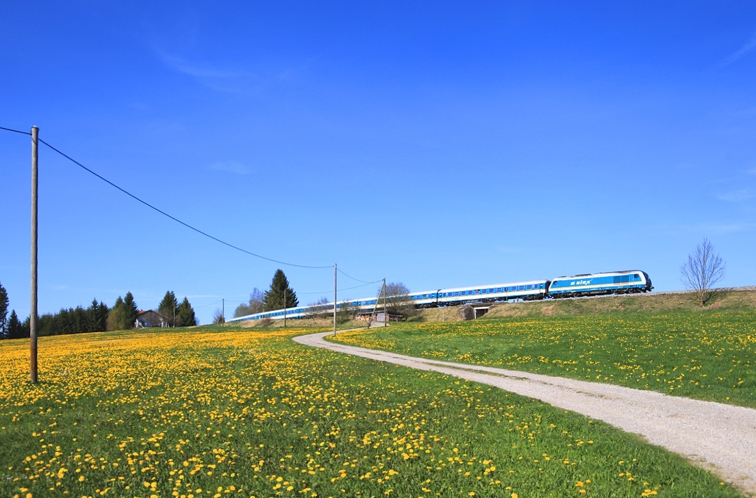 Die 223 072 mit einem ALX nach München am 22.04.2018 unterwegs bei Oberteich.