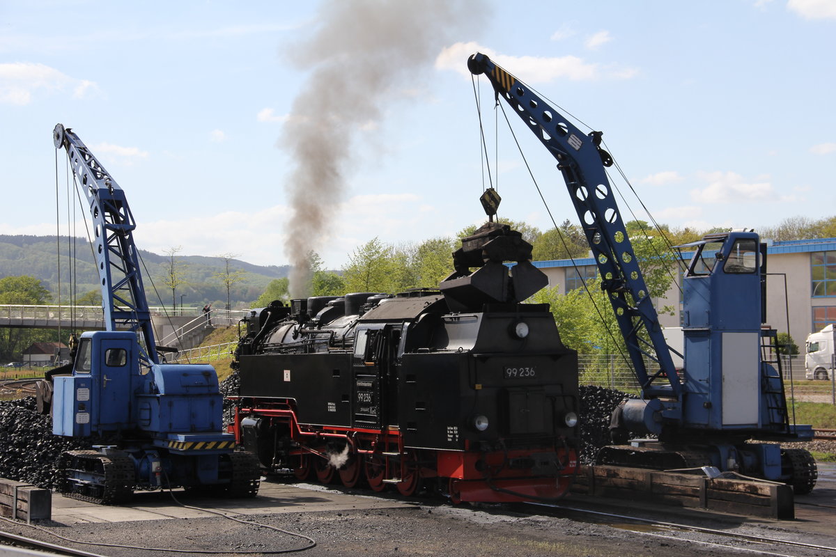 Der Tender der Lok 99236 der Harzer Schmalspurbahn wird am Bahnhof Wernigerode mit Kohle befüllt