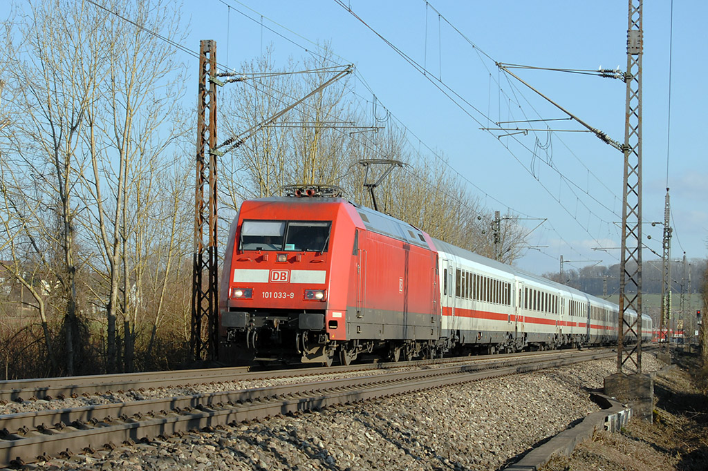 Nicht schnell genug reagiert, um die nur noch auf der Seite stehende Loknummer aufzunehmen. Bei Sulgen wurde eine unerkannt gebliebene Re 460 mit den Wagen des IC 822, Romanshorn - Brig, fotografiert. Am 29.03.2018 schob Re 460 018 den Zug nach, die auf der Stirnseite noch die Loknummer hatte.