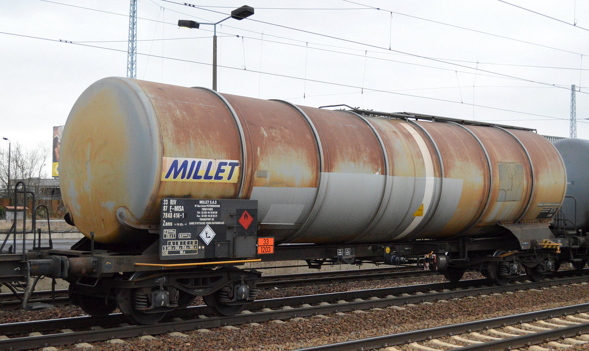 Französischer Kesselwagen vom Einsteller MILLET S.A.S mit der Nr. 33 RIV 87 F-MISA 7848 414-1 Zans (UN-Nr.: 33/1203 = Benzin oder Ottokraftstoffe) am 14.03.18 Bf. Flughafen Berlin Schönefeld.