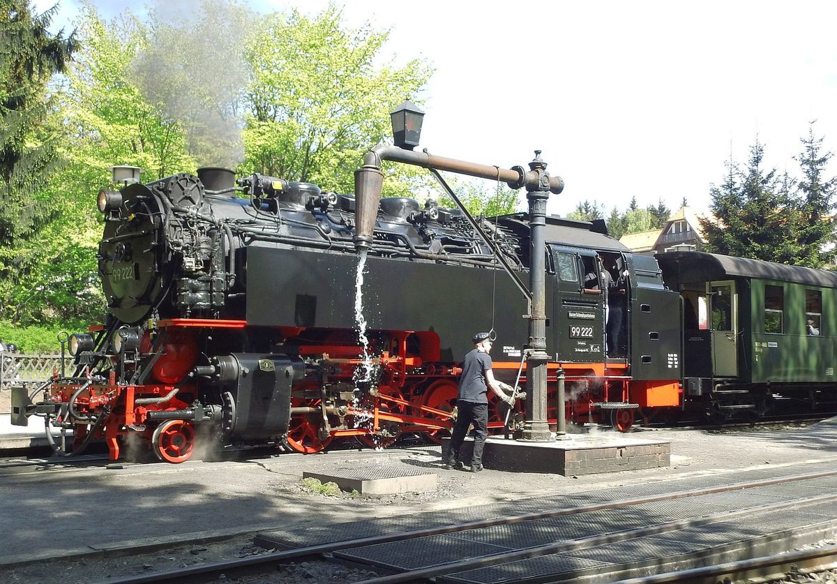 Am 05.05.2018 löscht hier in Drei Annen Hohne 99 222 vor dem Traditionszug ihren Durst am Wasserkran,der grad aus dem Wasserbehälter heraus geschwenkt wurde.