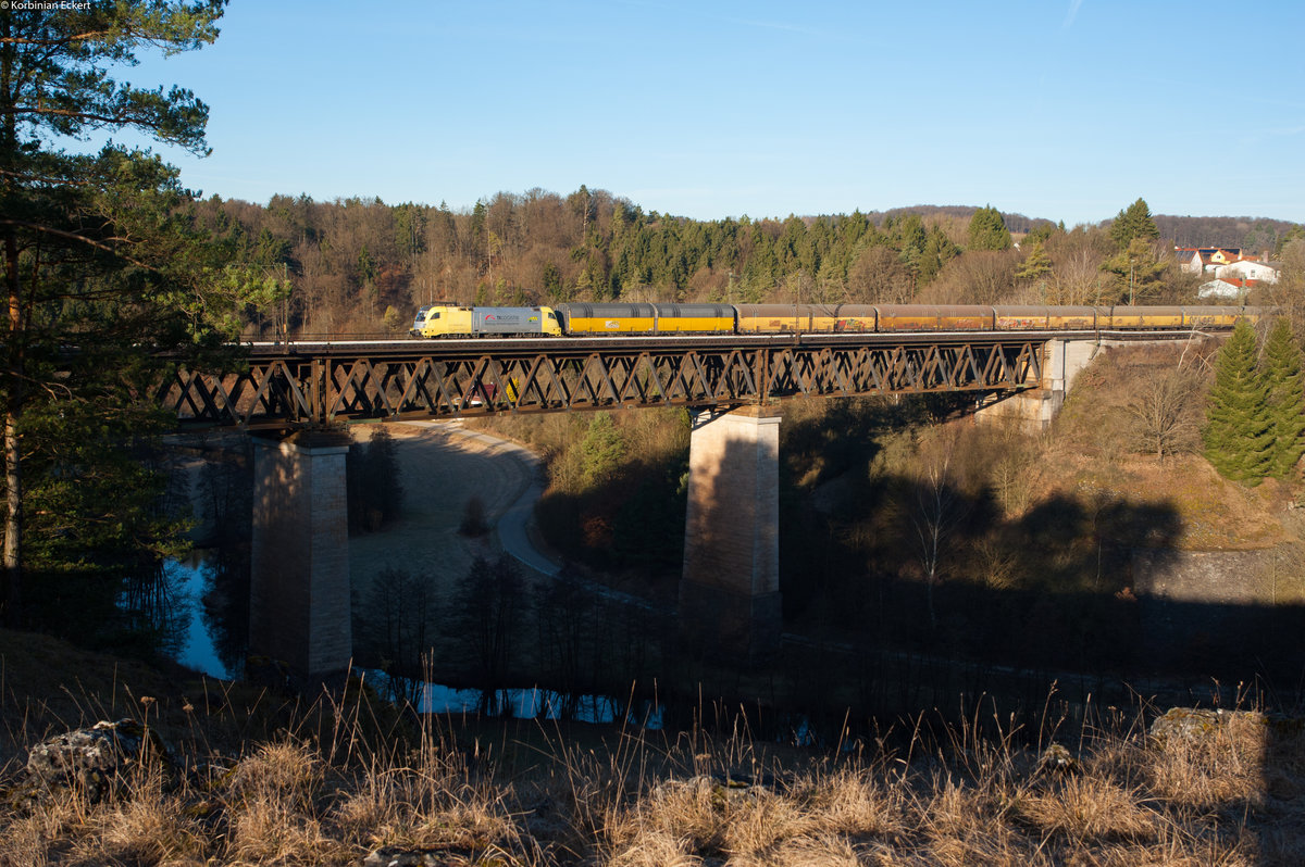 Eine unbekannte 145 mit einem gemischten Güterzug bei Beratzhausen Richtung Regensburg, 04.03.2017
