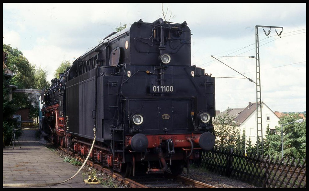Im Rahmen einer Sonderveranstaltung in Minden kamen am 5.9.1993 die Dampfloks 41241 und 011100 in das damals noch bestehende BW Löhne. 011100 ist hier beim Wasserfassen zu sehen. Da es damals schon keinen funktionierenden Wasserkran mehr gab, musste die Lok mittels Feuerwehr Schlauch versorgt werden.
