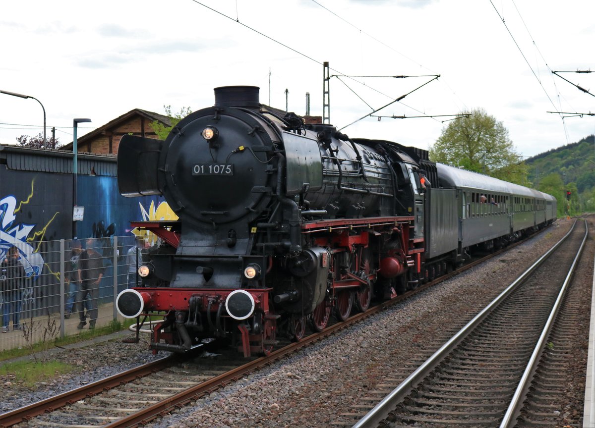Stoom Stichting Nederland 01 1075 erreicht mit Sonderzug beim Dampfspektakel am 28.04.18 in Schweich Bahnhof
