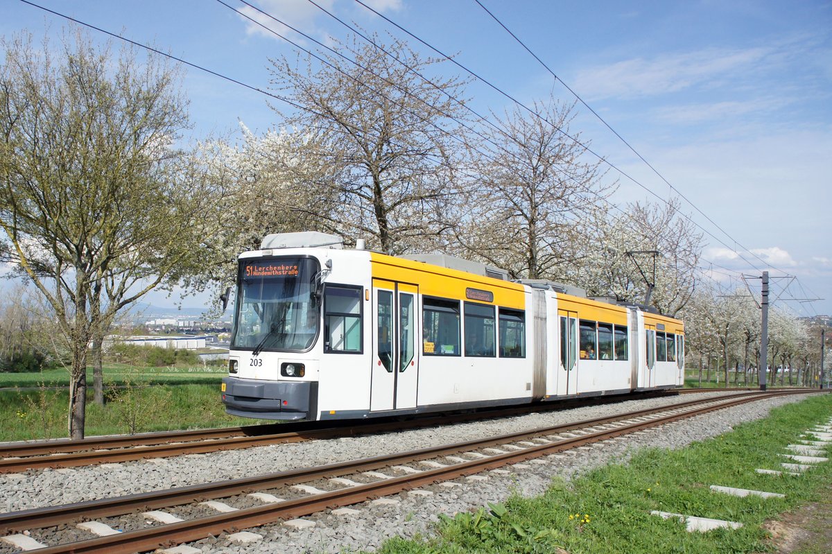 Straßenbahn Mainz / Mainzelbahn: Adtranz GT6M-ZR der MVG Mainz - Wagen 203, aufgenommen im April 2018 bei der Bergfahrt zwischen Mainz-Lerchenberg und Mainz-Marienborn.