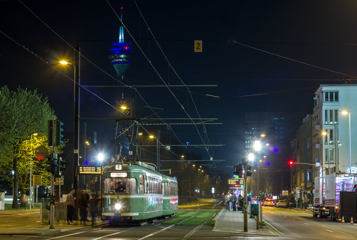 Zur Nacht der Museen kamen am 14. April 2018 Oldtimer auf der Strecke zwischen dem Düsseldorfer Hauptbahnhof und dem Medienhafen zum Einsatz. Gegen 23:45 Uhr konnte ich Großraumwagen 114 mit Beiwagen 1629 auf dem Weg zum Hauptbahnhof am Graf-Adolf-Platz fotografieren.