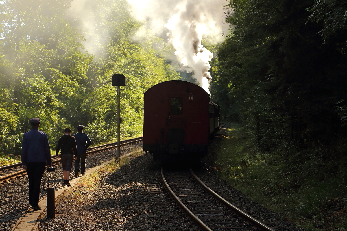 Auch wenn es so aussieht, NEIN, hier wird kein Verhafteter abgeführt! ;-) Nach erfolgter Ausfahrt von 99 5906 mit ihrem Jubiläumssonderzug am 07.07.2018 aus dem Bahnhof Eisfelder Talmühle, hat dieser jetzt angehalten, um die Fotografen wieder aufzusammeln, welche ihm jetzt im Gänsemarsch zustreben.