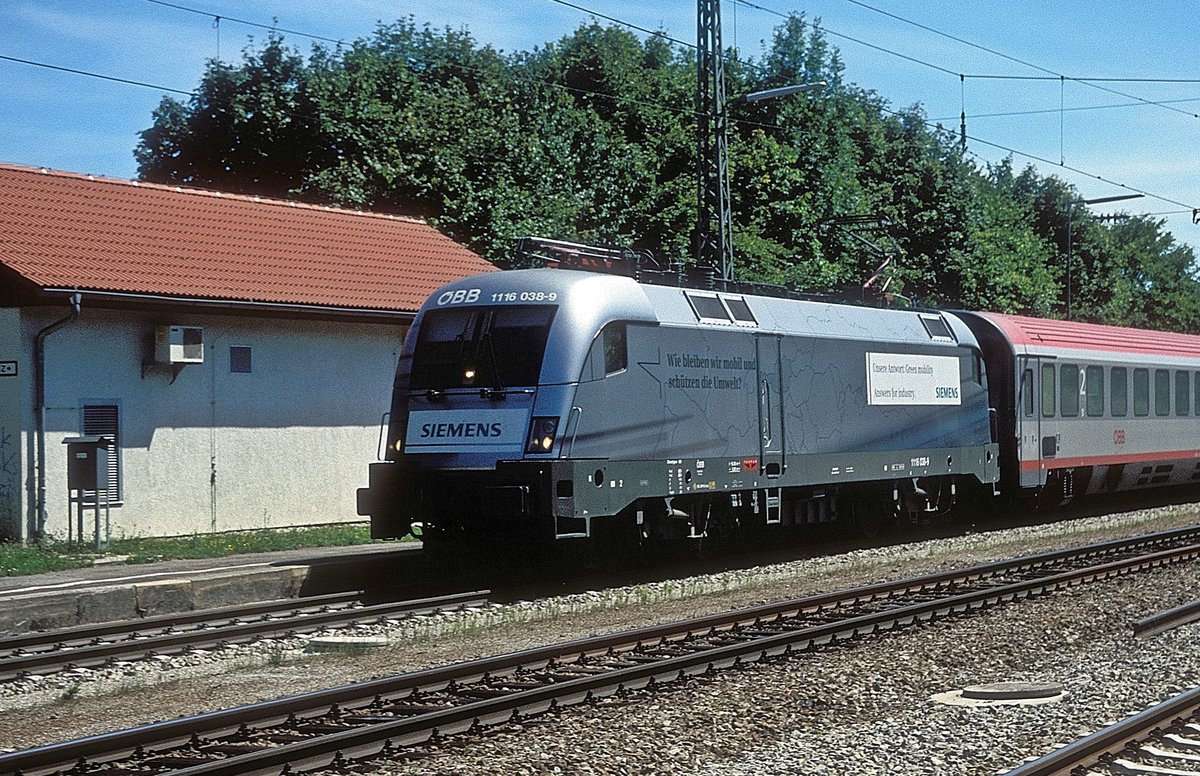 Ge 4/4 II 616 "Filisur", mit Werbung für Siemens, der Rhätischen Bahn (RhB) als RE 1763 nach Disentis/Mustér (CH) wird in seinem Startbahnhof Chur (CH) auf Gleis 11 bereitgestellt.