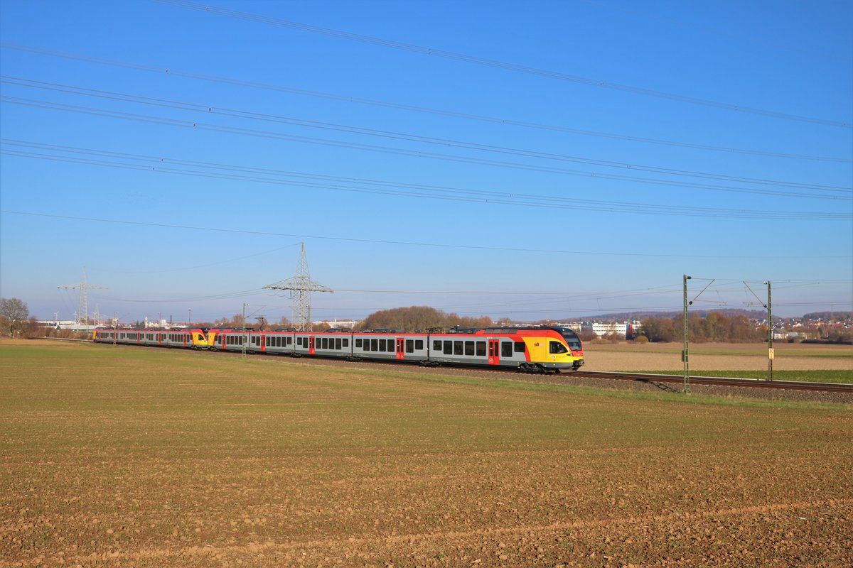 Hessische Landesbahn Stadler Flirt 429 xxx und 429 xxx als RE99 am 18.11.18 auf der KBS630 bei Bad Vilbel Dortelweil