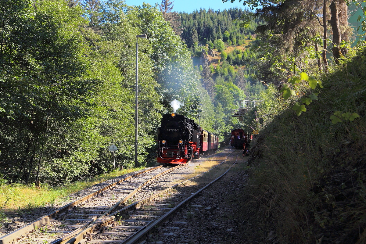 Vorbeifahrt von 99 7235 mit P8964 (Eisfelder Talmühle - Quedlinburg) am 07.07.2018 am Unterberger Steinbruch. (Bild 1) Auf dem Anschlußgleis des Steinbruches wartet derweil 99 5906 mit einem Sonderzug auf die Weiterfahrt.