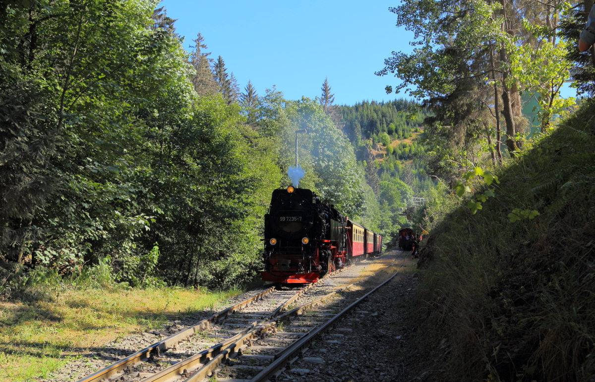 Vorbeifahrt von 99 7235 mit P8964 (Eisfelder Talmühle - Quedlinburg) am 07.07.2018 am Unterberger Steinbruch. (Bild 3) Sehr schön ist hier auch die erhebliche Steigung der Strecke zu sehen, bei welcher zwischen Eisfelder Talmühle und Birkenmoor auf gerade mal 6 Kilometer 181 Höhenmeter überwunden werden müssen.