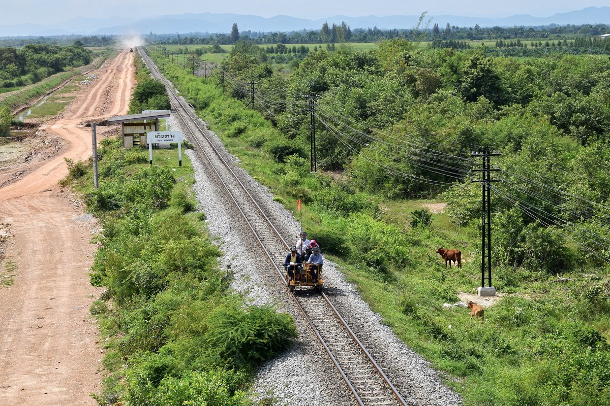 Ein Inspektionstrupp der SRT ist auf einer motorbetriebenen Draisine am Haltepunkt Huai Khwang am 19.11.18 unterwegs. Links ist die Trasse für die vorgesehene Schnellfahrstrecke Kunming (China) - Vientiane (Laos) - Bangkok - Kuala Lumpur (Malaysia) - Singapur zu sehen.