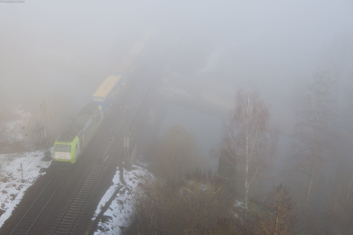 185 212-8 tauchte mit ihrem Mischer aus dem Nebel bei Dollnstein Richtung Ingolstadt auf und überquert hier gerade die Altmühl, 24.03.2018
