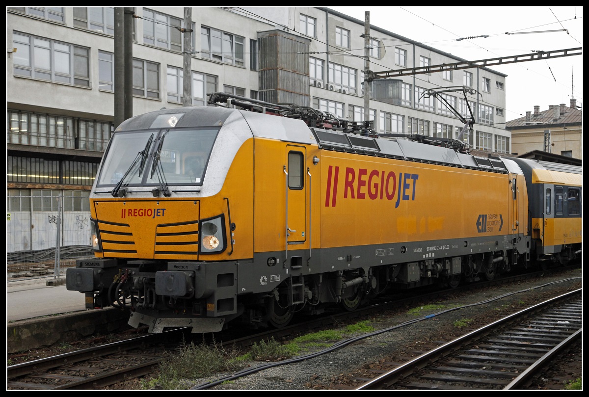 193 226 fährt am 27.11.2018 mit einem Regiojet in Breclav am Bahnsteig 3 ein.