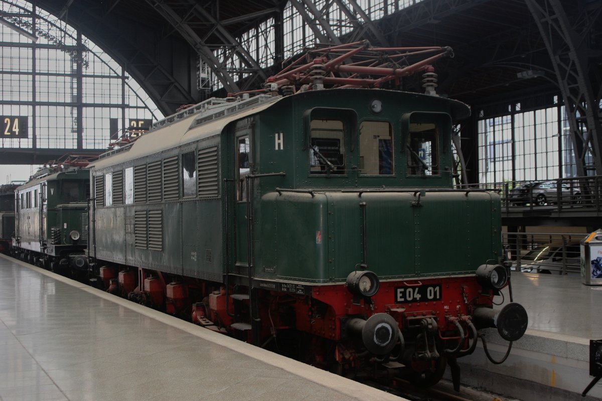 Als drittes von fünf Fahrzeugen auf dem Museumsgleis zeigt sich die E 04 01 des Rbd Halle von ihrer schönsten Seite. Die Maschine besitzt sogar eine 11 stellige Nummer: 91 80 6 104 001 - 6 D-DB.