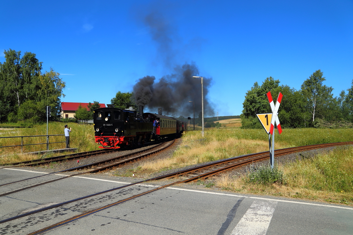 Nachdem 99 1574 im Bahnhof Glossen sich für die Rückfahrt ans andere Zugende gesetzt hatte, führte sie ihren Zug am 13.10.18 zwischen Nebitzschen und Mügeln zurück Richtung Oschatz.