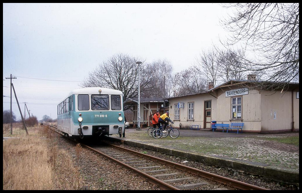 Ferkeltaxe 771010 hält hier auf der Fahrt von Schönebeck nach Blumenberg am 24.1.1999 um 14.25 Uhr in Bahrendorf. - Der Triebfahrzeugführer gab mir die Zeit, schnell auszusteigen und ein Foto zu machen. Eine kleine Erinnerung an den heute dort nicht mehr bestehenden Personenverkehr auf der Schiene.
