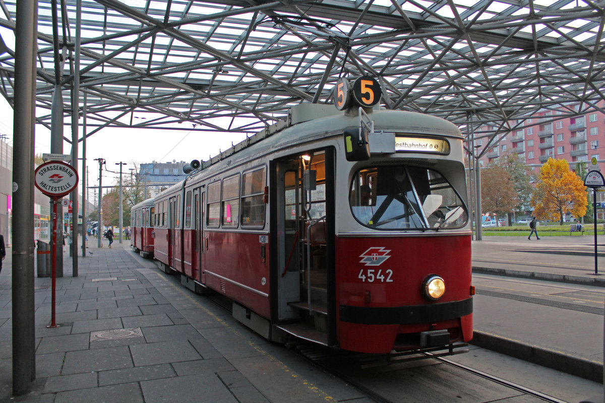 Wien Wiener Linien SL 5 (E2 4542 + c4 1339) II, Leopoldstadt, Praterstern am 19. Oktober 2018. - Hersteller der beiden Wagen: Bombardier-Rotax, vormals Lohnerwerke. Baujahr: 1975.