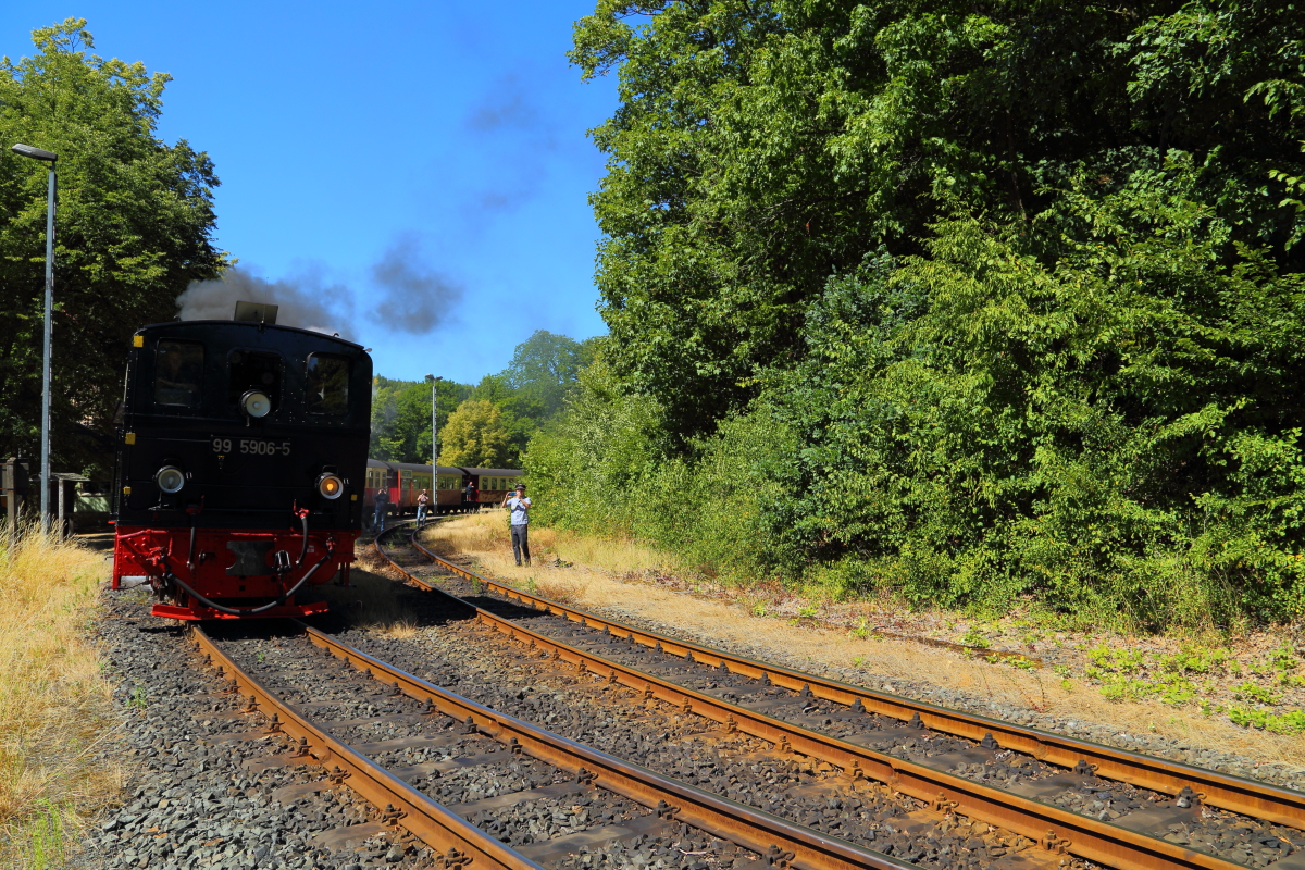Nach Kreuzung mit einem Sondertriebwagen am 07.07.2018 geht 99 5906 im Bahnhof Mägdesprung nun von ihrem Jubiläumssonderzug, um ans andere Ende desselben umzusetzen.