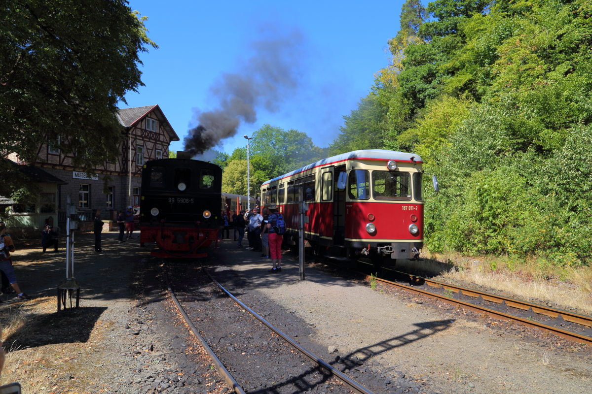 Nachdem Triebwagen 187 011 am 07.07.2018 als Sonderfahrt "Schlemmerexpreß" in den Bahnhof Mägdesprung eingefahren ist, kommt es nun zu einer Begegnung mit den Fahrgästen des auf dem Nachbargleis stehenden Jubiläumssonderzuges.