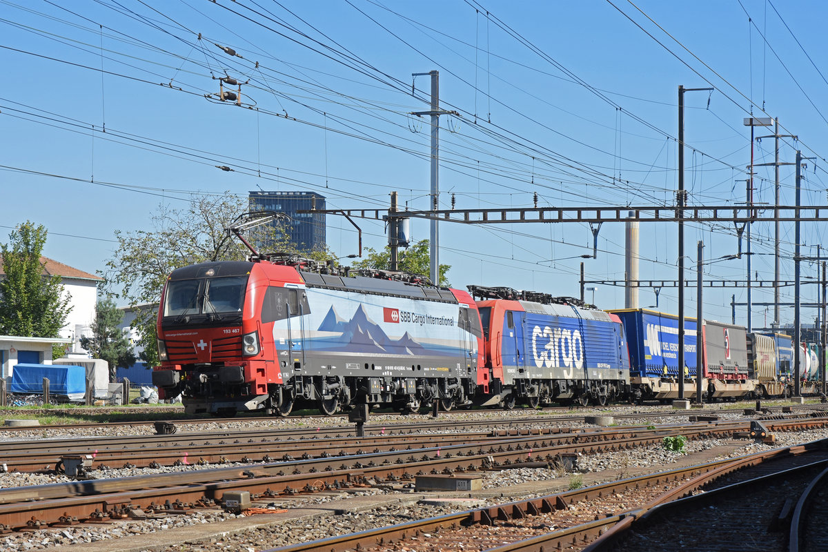 Lok 193 467-8 und die kalte Re 474 004-9 durchfährt den Bahnhof Pratteln. Die Aufnahme stammt vom 27.09.2018.