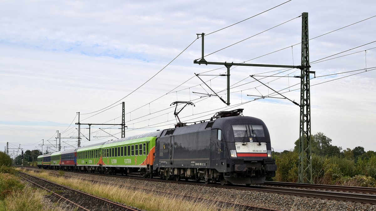 ES64 U2 - 028 ist hier mit Flixtrain Zug nach Köln hier am 30.09.2018 um 15.34 Uhr am Ortsrand von Hasbergen auf der Rollbahn.