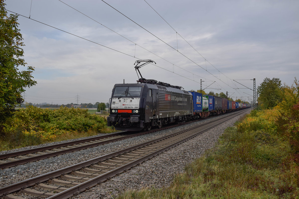 Am 11.10.2018 befördert 189 288 einen KV-Zug von Rotterdam Waalhaven in Richtung Mortara.
