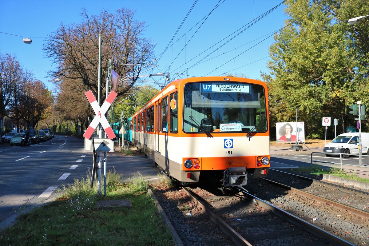 VGF Düwag U3 Wagen 151 am 13.10.18 zur U3 Wagen Abschiedsfahrt in Frankfurt am Main Riederwald Schäfflestraße auf der U7