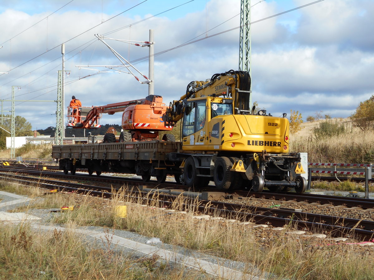 Zweiwegebagger an der westlichen Bahnhofseinfahrt von Bergen/Rügen am 07.Oktober 2018.
