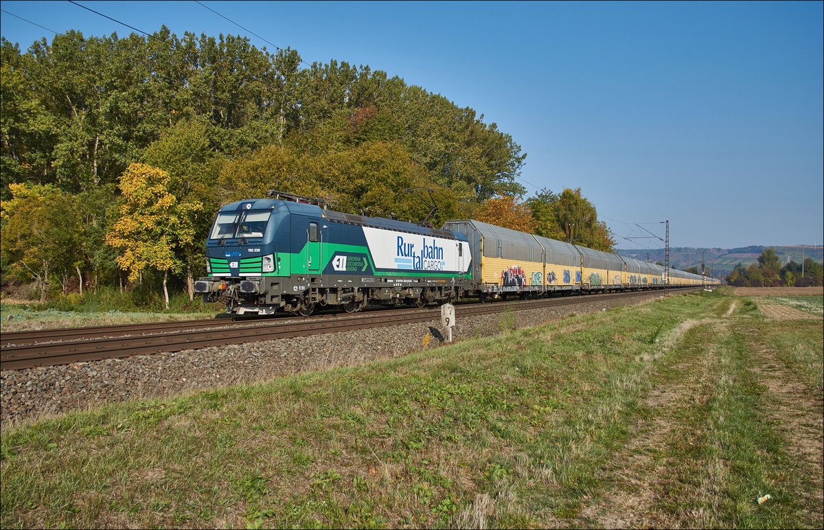 193 230 ist mit einen Autozug am 10.10.2018 bei Retzbach-Zellingen unterwegs.