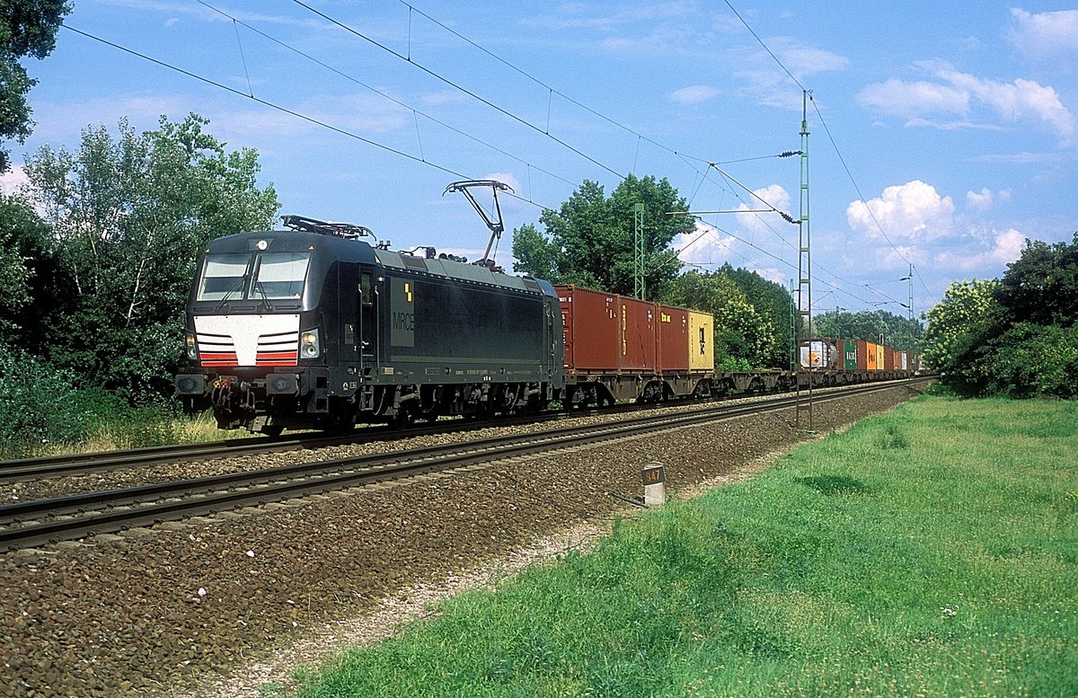 193 875 "Connecting Europe" passiert am 27.07.2018 mit einem ARS-Zug den Bahnhof Eichenberg.
