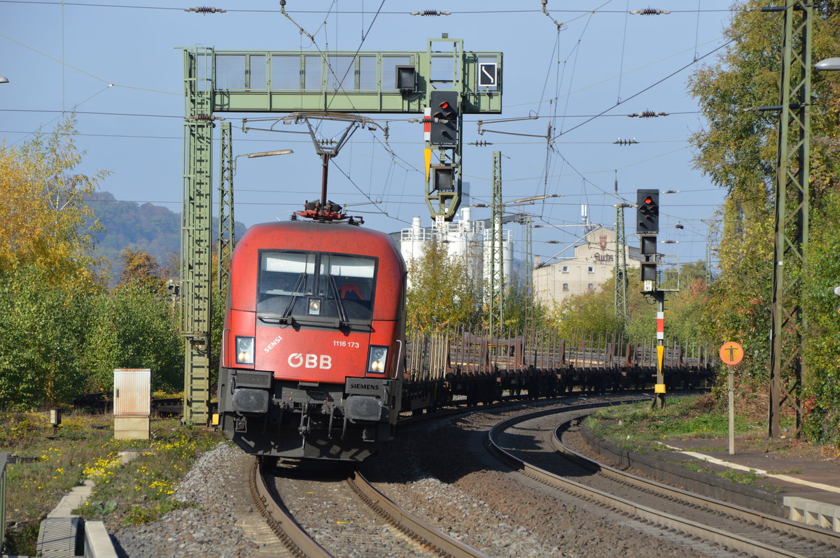 Mit dem Dunkelwerden am Freitagabend kommt die 1116 173 mit einem Schienenzug in Lintorf an und muss auch vor dem Signal anhalten und lange warten. Leider konnte ich nicht so lange warten bis sie wieder Hp1 bekam.19.10.2018