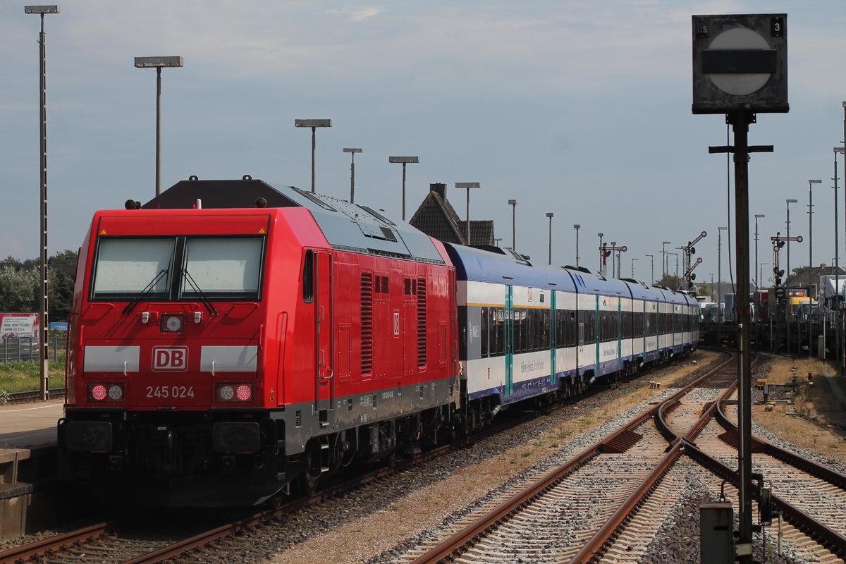 245 024 schiebt am 12.07.2018 einen RE6 nach Hamburg-Altona. Aufgenommen in Westerland (Sylt).