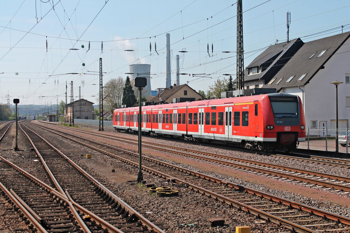 Mit dem Kraftwerk von Ensdorf (Saar) im Hintergrund, fuhr am 12.04.2017 der SÜWEX 429 100 durch die gleichnamige Ortschaft als RE1 (Mannheim Hbf - Koblenz Hbf)in Richtung Saarlouis.