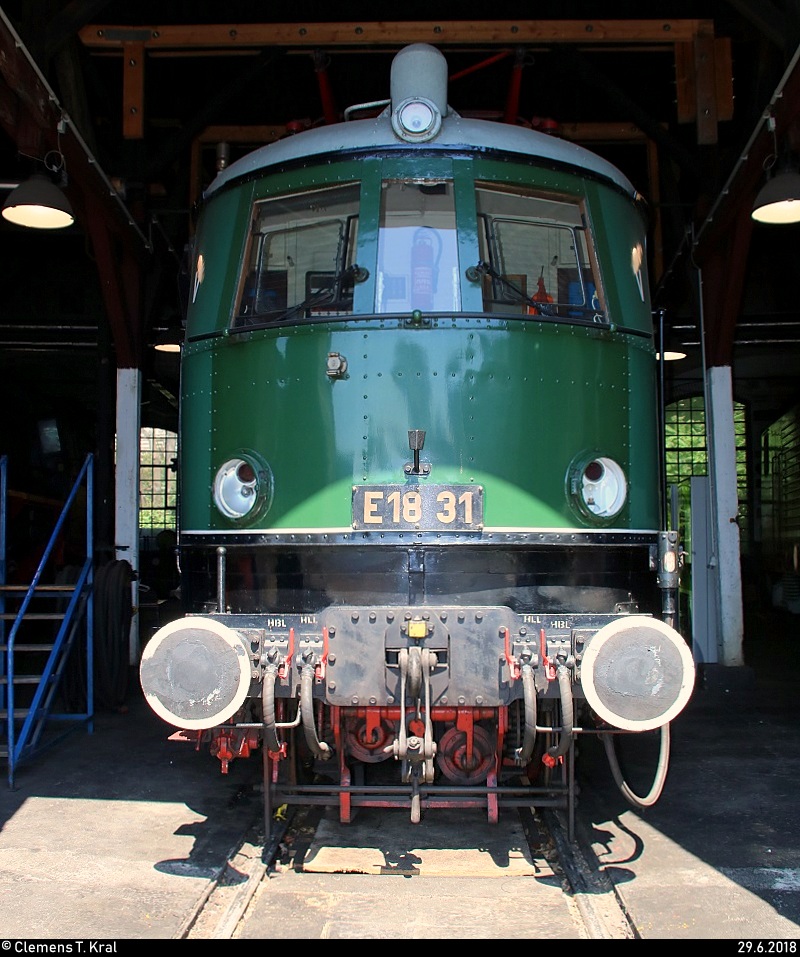 Blick auf 118 031 (218 031-3 | E18 031) der Traditionsgemeinschaft Bw Halle P e.V., die im Ringlokschuppen ausgestellt ist.