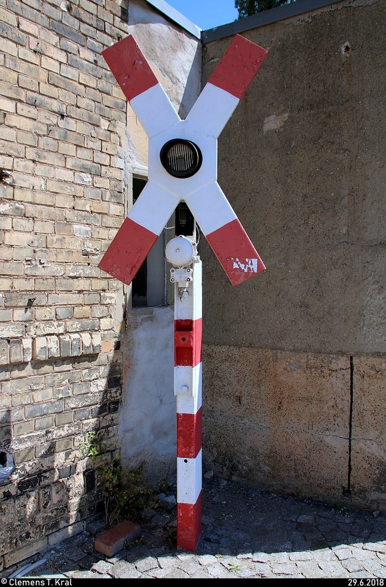 Blick auf ein Andreaskreuz von einem WSSB-Bahnübergang, der neben dem Eingang zum Ringlokschuppen ausgestellt ist.
