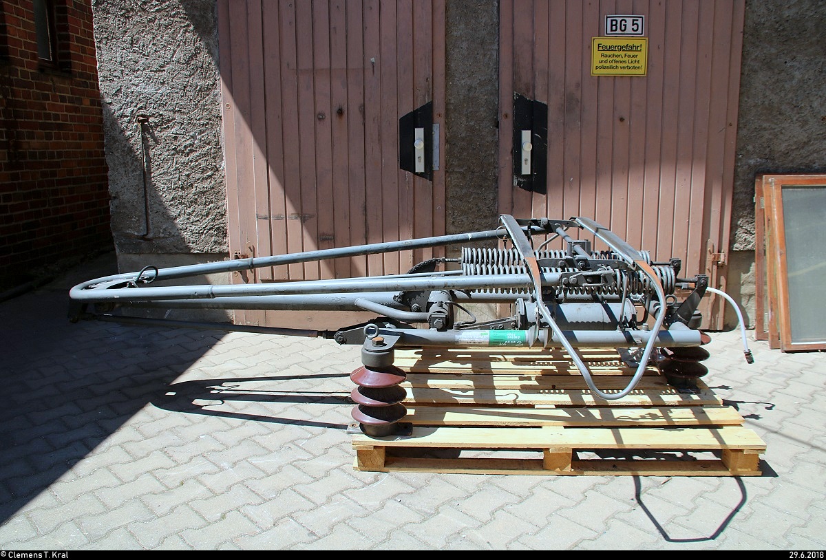 Blick auf einen Einholmstromabnehmer, der neben dem Ringlokschuppen ausgestellt ist.